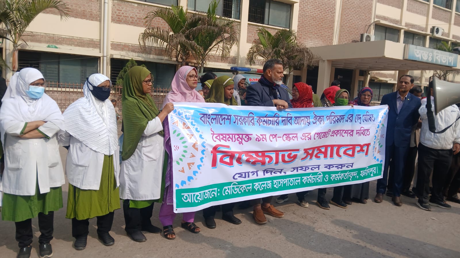 মেডিকেল টেকনোলজিস্ট শেখ নুরুল আমিনের সভাপতিত্বে হাসপাতালের বহিঃবিভাগের সামনে অনুষ্ঠিত বিক্ষোভ সমাবেশে হাসপাতালের বিভিন্ন বিভাগের কর্মকর্তা-কর্মচারীরা অংশগ্রহণ করেন।