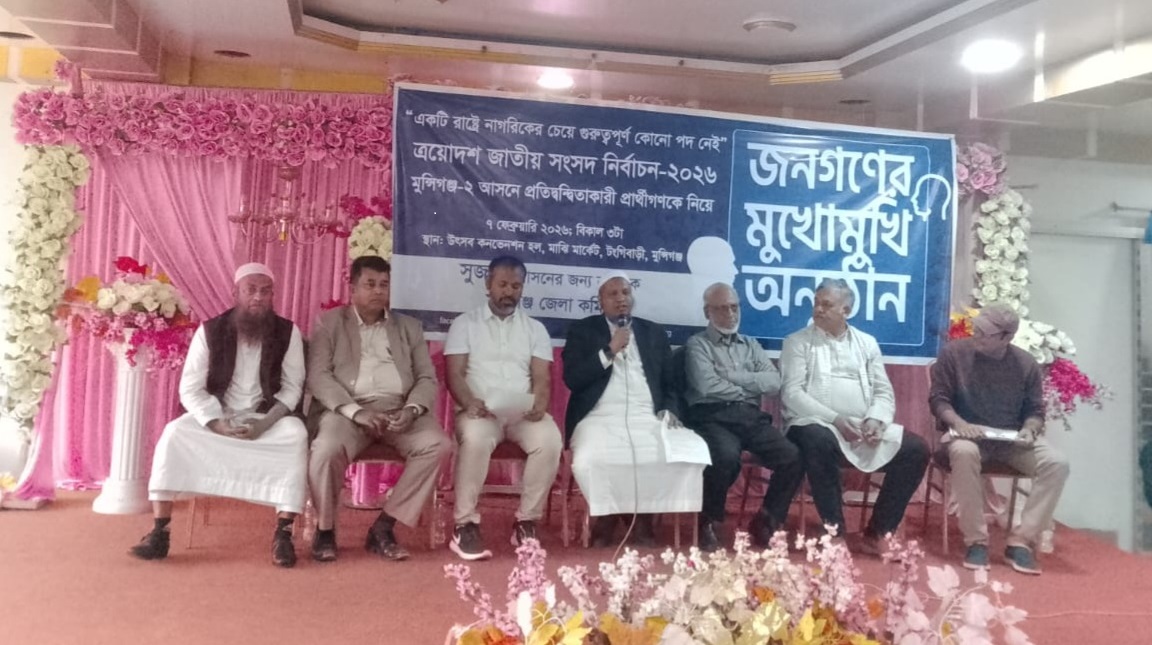 এম জামাল হোসেন মন্ডল : “একটি নাগরিকের চেয়ে গুরুত্বপূর্ণ কোন পদ নেই” -এ শ্লোগানকে সামনে রেখে সুজন সুশাসনের জন্য নাগরিক মুন্সীগঞ্জ জেলা কমিটির আয়োজনে ত্রয়োদশ জাতীয় সংসদ নির্বাচন-২০২৬ উপলক্ষে মুন্সীগঞ্জ-২ আসনে প্রতিদ্বন্দ্বিতাকারীদের নিয়ে “জনগণের মুখোমুখি” অনুষ্ঠান অনুষ্ঠিত হয়েছে। উক্ত অনুষ্ঠানে উপস্থিত ছিলেন মুন্সীগঞ্জ-২ আসনের ১০ দলীয় জোট জাতীয় নাগরিক পার্টি (এনসিপি) মনোনীত প্রার্থী মোঃ মাজেদুল ইসলাম শাপলা কলি প্রতীক, বাংলাদেশ ইসলামি আন্দোলনের হাতপাখা প্রতীকের প্রার্থী কে এম বিল্লাল হোসাইন, সুজন সুশাসনের জন্য নাগরিক কমিটির কেন্দ্রীয় সমন্বয়কারী দীলিপ কুমার সরকার, ঢাকা আঞ্চলিক সমন্বয়কারী জিল্লুর রহমান, মুন্সীগঞ্জ জেলা শাখার সভাপতি ডঃ জাহাঙ্গীর আলম, সাধারণ সম্পাদক এডভোকেট জানে আলম প্রিন্স, সিনিয়র সহ-সভাপতি এম জামাল হোসেন মন্ডল, সহ-সভাপতি নজরুল ইসলাম মোল্লা, যুগ্ম সাধারণ সম্পাদক আবু হানিফ রানা প্রমুখ। এসময় উপস্থিত স্থানীয় জনগণ প্রর্থীদের নানা প্রশ্ন করেন এবং প্রার্থীরা তাদের প্রশ্নের উত্তর দেন।