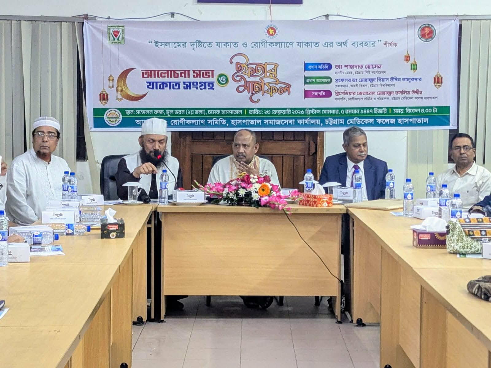 চট্টগ্রাম সংবাদদাতা : চট্টগ্রাম মেডিকেল কলেজ হাসপাতালস্থ সমাজসেবা কার্যালয়াধীন রোগীকল্যাণ সমিতি পবিত্র মাহে রমজান উপলক্ষে গত ২৩ ফেব্রুয়ারি “ইসলামের দৃষ্টিতে যাকাত ও রোগীকল্যাণে যাকাতের অর্থ ব্যবহার” শীর্ষক এক আলোচনা সভা, যাকাত সংগ্রহ এবং ইফতার মাহফিলের আয়োজন করে।